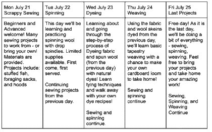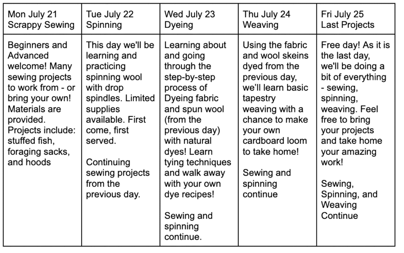 Each workshop will take place from 9am – 3pm each day. All materials are provided, but if you would like to bring your own: scissors, sewing needles, thread, pins, and a drop spindle is recommended.